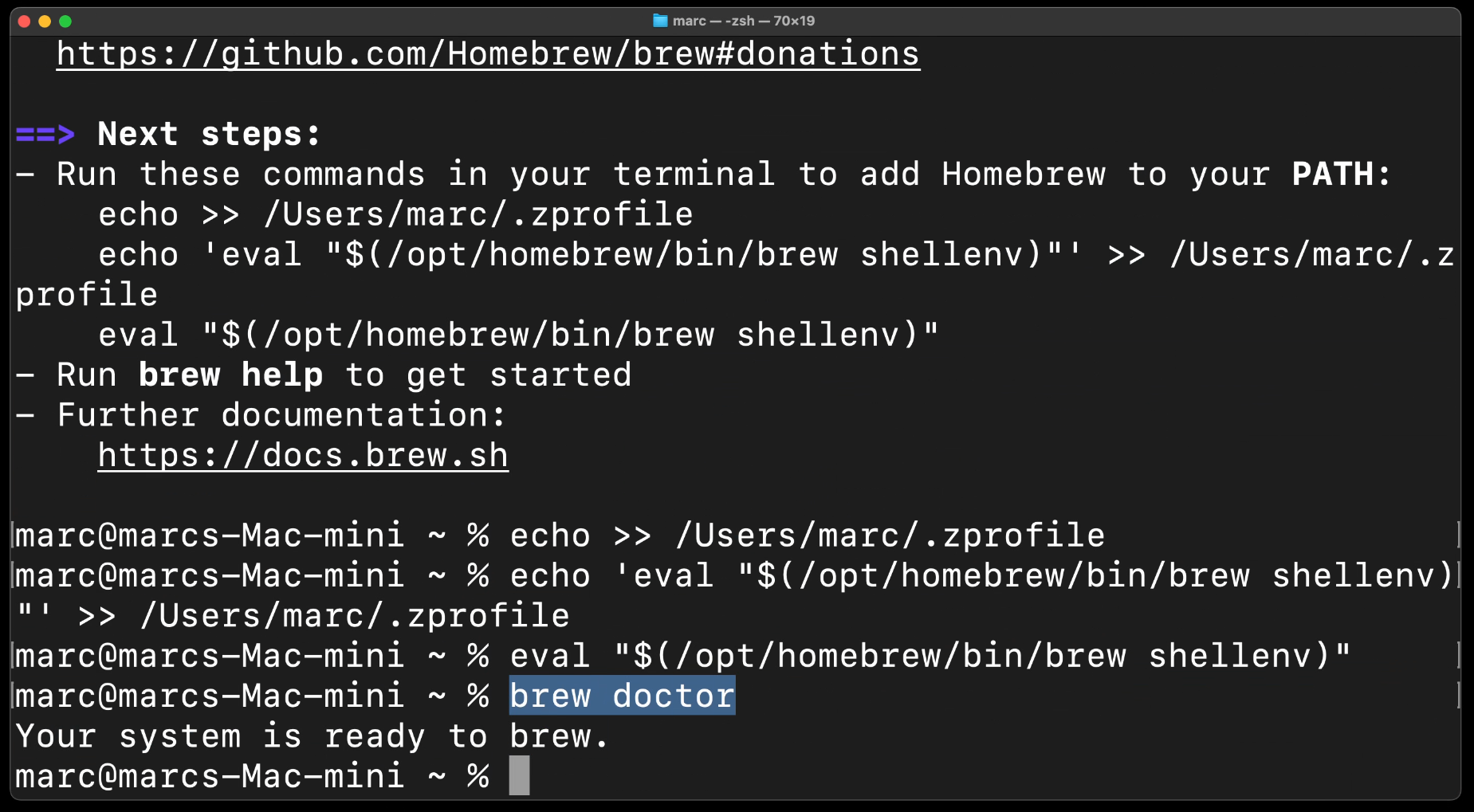 Jetzt kannst du im Terminal brew doctor eingeben, um sicher zu gehen, dass alles richtig installiert wurde.
