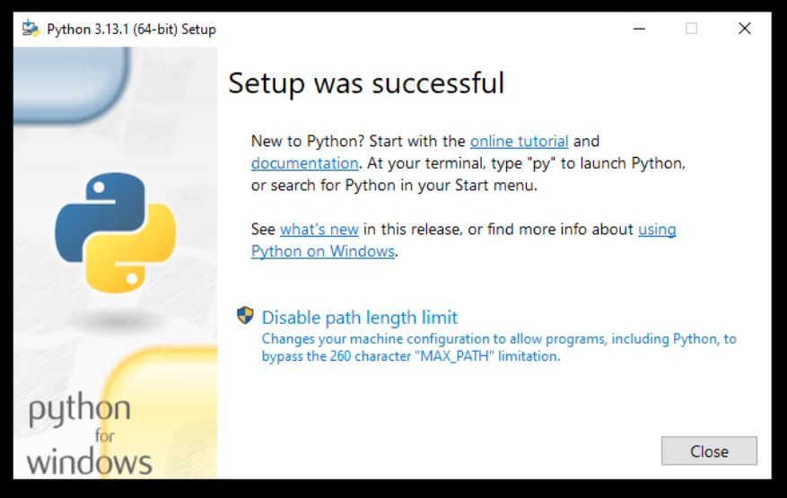 Wenn du "Setup was successfull" siehst, dann hat alles geklappt. Vielleicht siehst du noch im selben Fenster, wie ich hier, einen Text mit "Disable path length limit". Klicke einmal drauf, und die Meldung sollte dann auch von selber verschwinden.